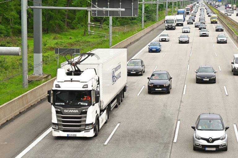 Innovative Oberleitungs-Lkw können nun auf zwölf Kilometern Autobahnstrecke von Frankfurt in Richtung