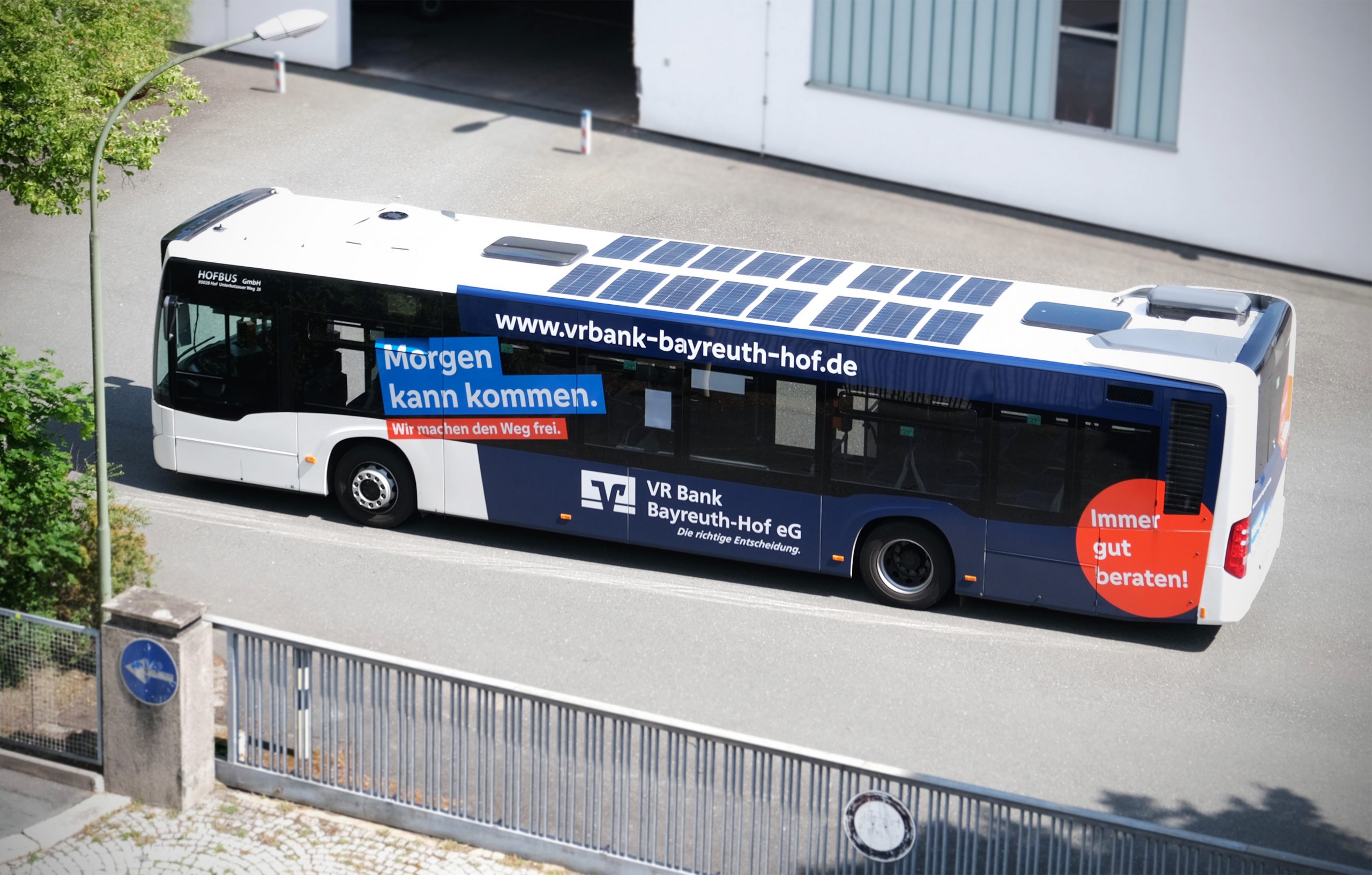 Der erste Bus mit integriertem Solar Bus Kit von Sono Motors hat vom TÜV die Straßenzulassung erhalten und ist seitdem im Hofer Stadtgebiet unterwegs. Zeitgleich wird ein baugleicher Mild-Hybrid-Bus ohne PV-Anlage eingesetzt. Durch diese Vergleichszahlen können Fahrleistung und Energieverbrauch, innerhalb einer bestimmten zurückgelegten Strecke, optimal verglichen werden.