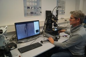 Stefan Regensburger kann anhand der geschliffenen Werkstoffproben im digitalen Mikroskop selbst kleinste Risse und Korrosion erkennen.