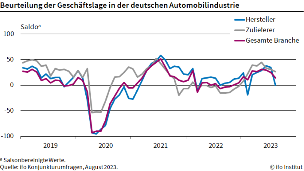 Die deutsche Fahrzeugbranche schätzt ihre aktuelle Geschäftslage schlechter ein als im Vormonat. Das geht aus den ifo Konjunkturumfragen hervor. Im August fiel der Indikator auf 12,7 Punkte, nach 22,1 Punkten (saisonbereinigt korrigiert) im Juli.